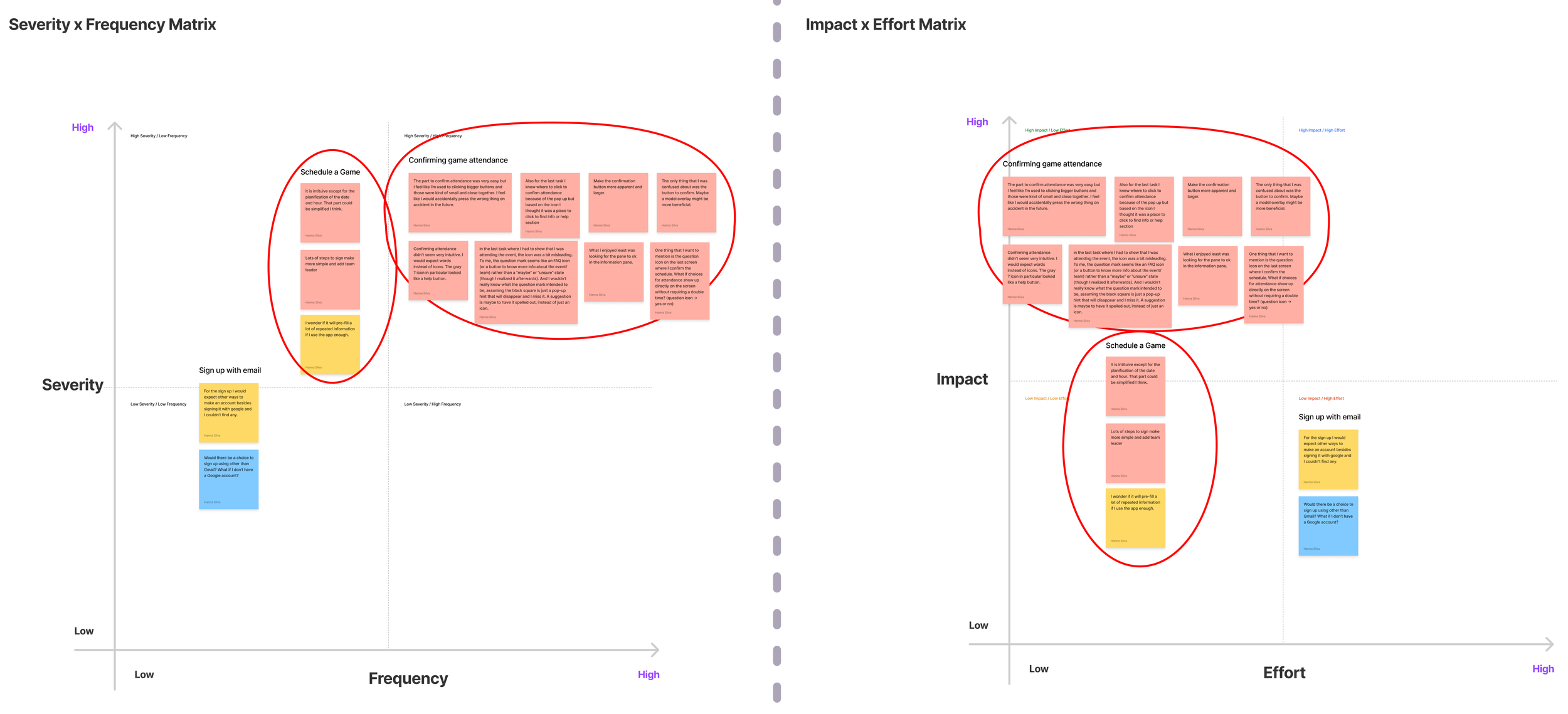 In order to prioritize participant feedback and understand which iterations were needed, I mapped out comments and used a severity x frequency matrix to identify the top usability issues and an impact x effort matrix to prioritize solutions in terms of feasibility for the MVP.