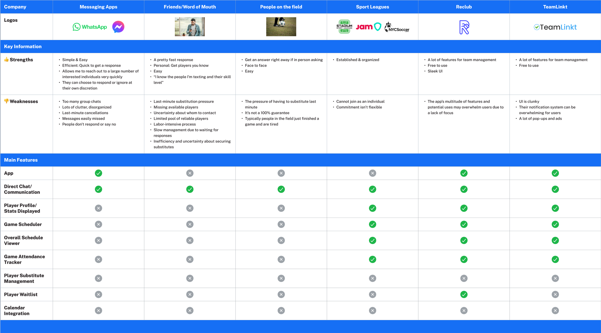 Even though most users rely on word of mouth, texts, and messaging services, we looked into other competitors' offerings. Our analysis revealed a common trend: competitors primarily focus on team management, game scheduling, and player communication features, neglecting the critical issue of last-minute substitutions.