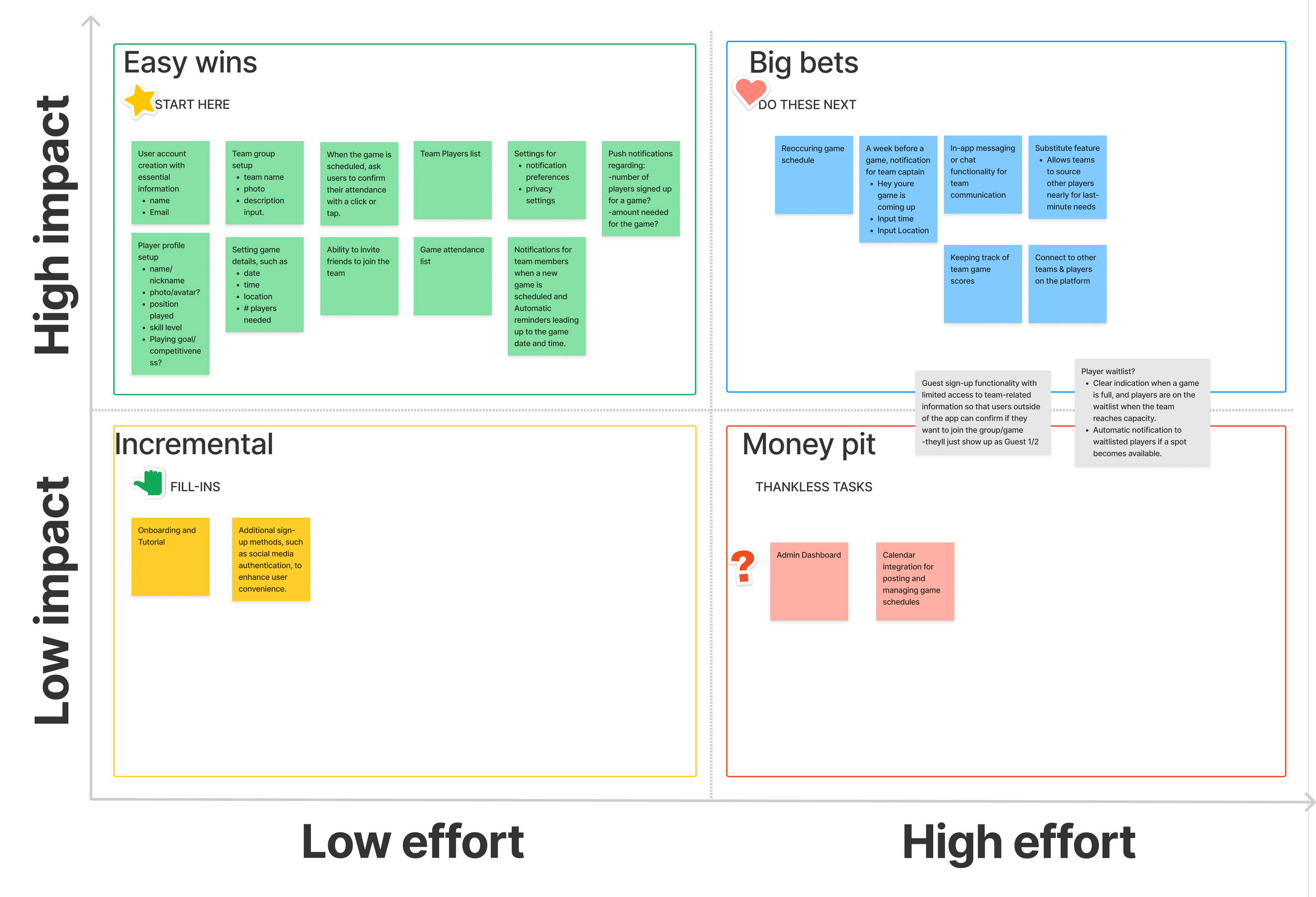 Our user research identified two primary personas: the team captain and the team player. To prioritize effectively within our time and feasibility constraints, we chose to focus our MVP on addressing the team captain's pain points including game coordination difficulty, communication struggles, and last-minute player scheduling changes.