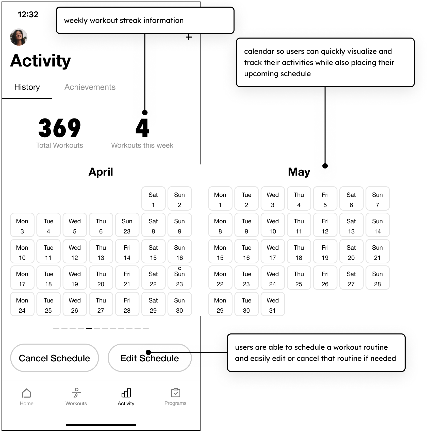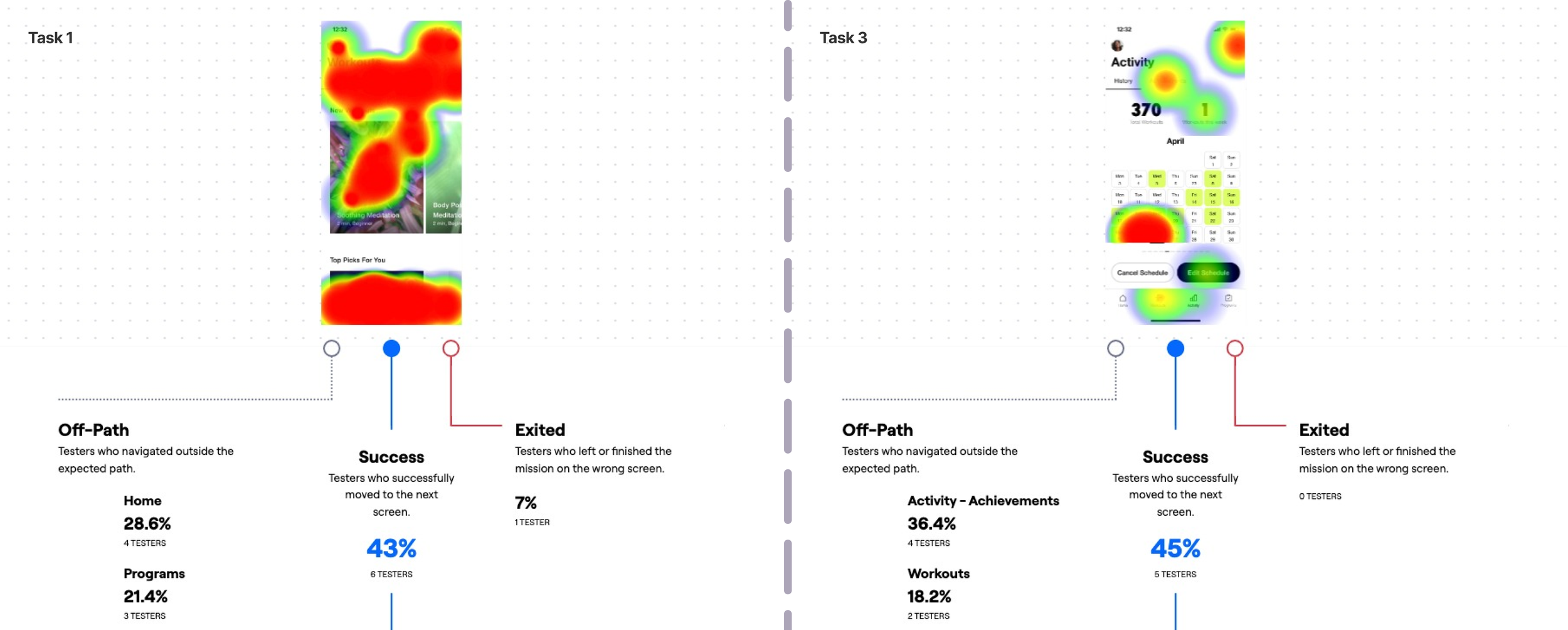 For Task 1, the main usability struggle that participants faced was understanding where the flow began. I has originally imaged scheduling a workout routine next to the schedule (located in the activities tab). However, participants reported expecting to see it under the “workouts”.