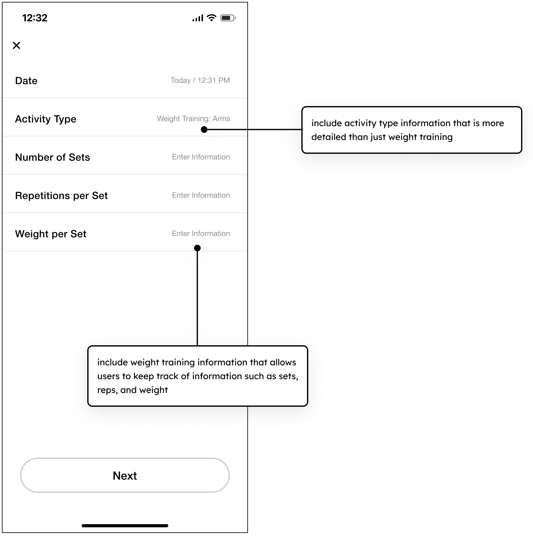 Adds to the NTC activity feature by allowing users the ability to provide more detailed information on their completed activities, including specific details such as arm weight training
